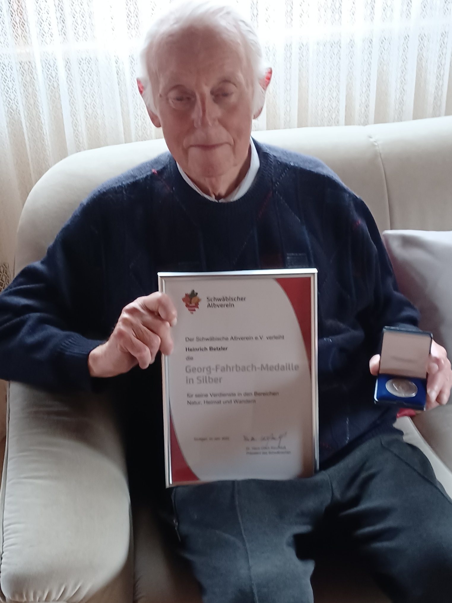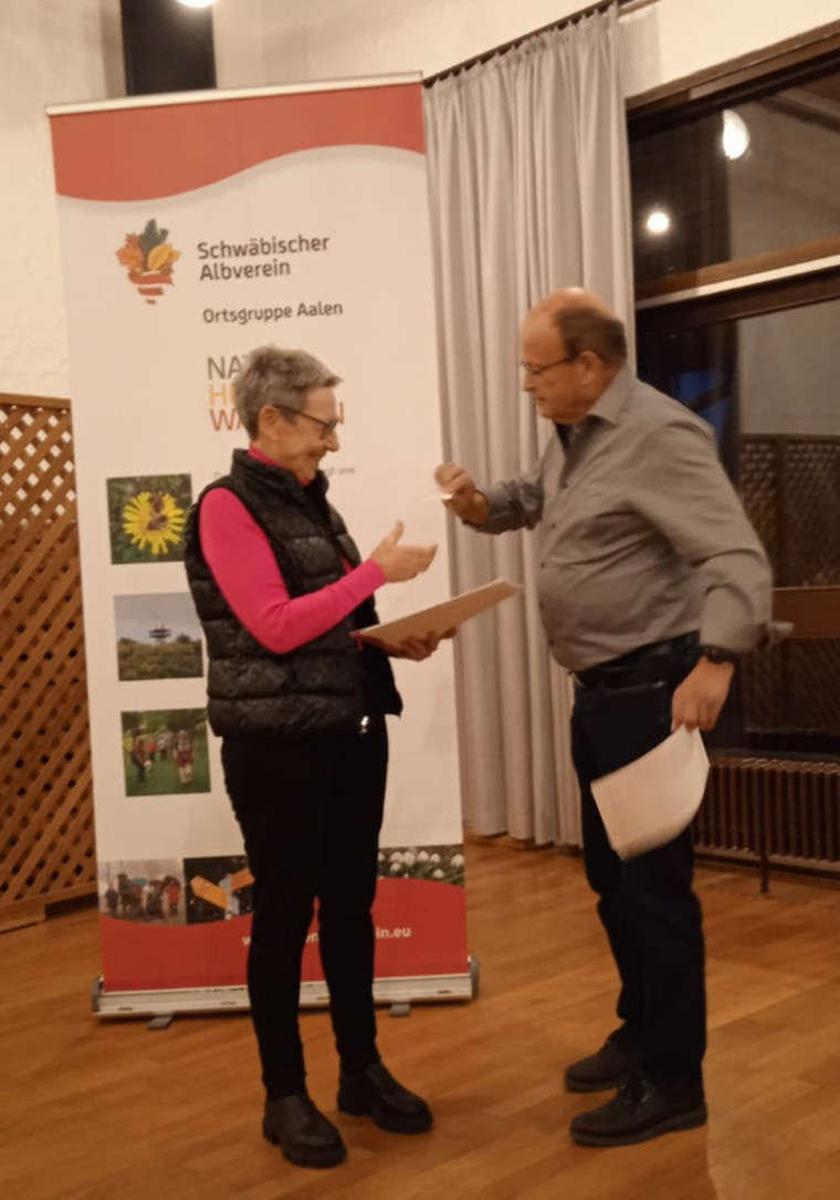 Für sein vielfältiges Engagement beim Schwäbischen Albverein wurde Heiner Betzler aus Aalen mit der höchsten Auszeichnung geehrt, die der Wanderverein zu vergeben hat, mit der Georg-Fahrbach-Medaille in Silber. (Nur Präsidenten können die Medaille in Gold bekommen) Seit 25 Jahren ist Betzler ehrenamtlicher Gauwegmeister im Nordostalbgau. Darüber hinaus betreut er seit 2008 als Wegewart der Ortsgruppe Aalen und seit 2017 auch der aufgelösten Ortsgruppe Unterkochen an die 80 km Wege und den Aalener Panoramaweg. Ortsgruppenvorsitzende Ute Hommel bedankte sich bei Betzler auch im Namen des Nordostalbgaus und des gesamten Vorstands für seinen langjährigen Einsatz.