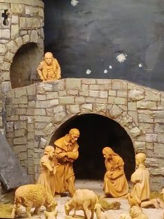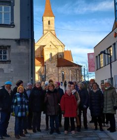 Kenntnisreich und humorvoll führte Annette Bezler die Gäste aus Aalen zu einigen Krippen des Ellwanger Krippenwegs. Vor der Weihnachtskrippe von Johannes Hils in der Basilka erläuterte sie, dass Krippen ähnlich wie die Mysterienspiele den Menschen, die nicht lesen konnten, biblische Inhalte näher brachten. Das Besondere dieser Krippe sei zudem, dass Glaubensverkünder für Ellwangen dort zu sehen seien.